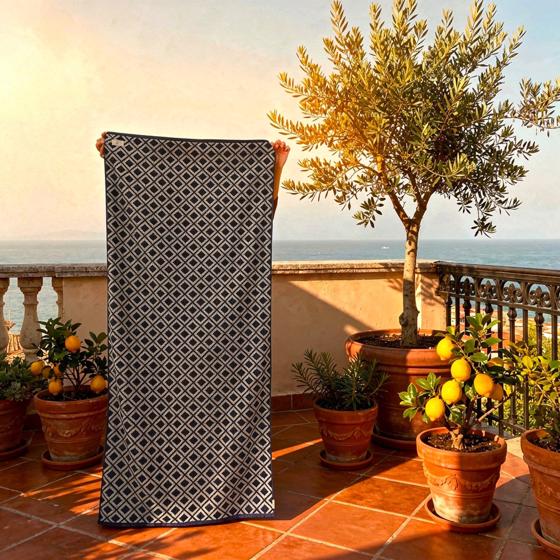Ideale da stendere sulla sabbia, a bordo piscina o da portare con sé in barca, questo telo unisce praticità e stile, diventando un accessorio immancabile per l’estate.