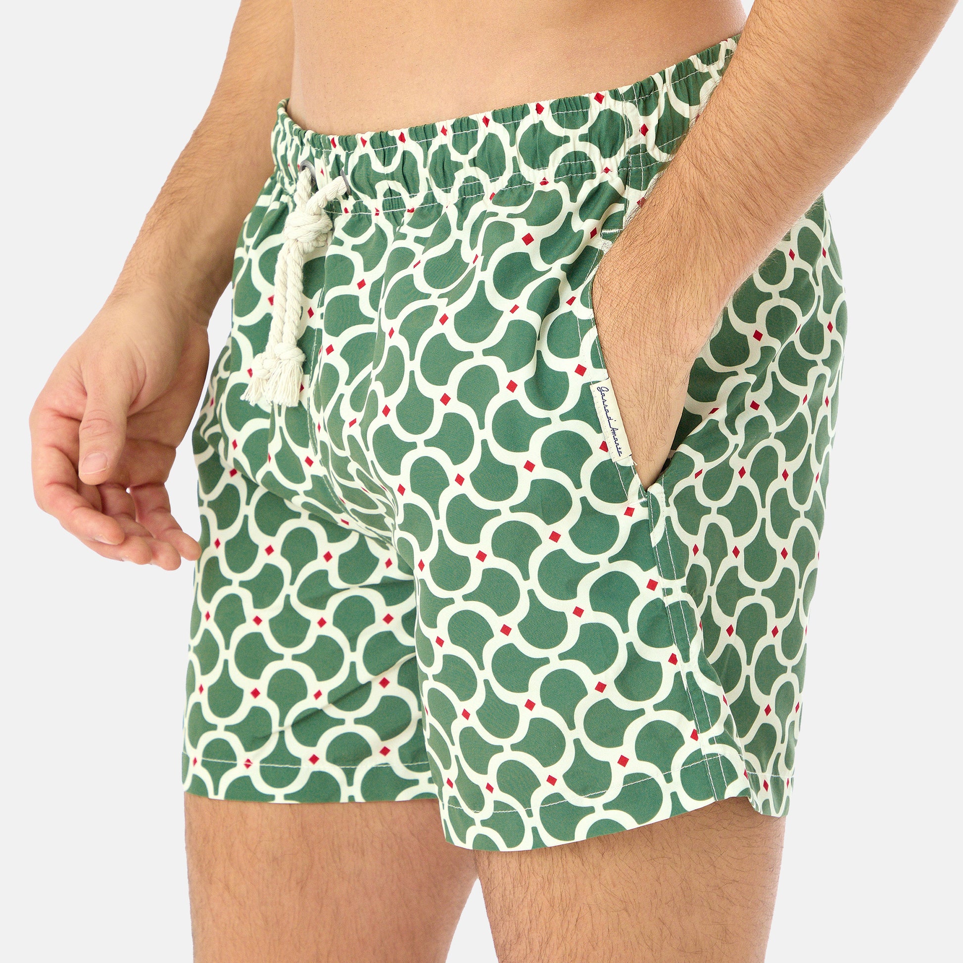 Totalmente cucito a mano, possiede una corda classica nautica in cotone, un’etichetta ricamata posta sul retro del costume e una doppia tasca laterale.