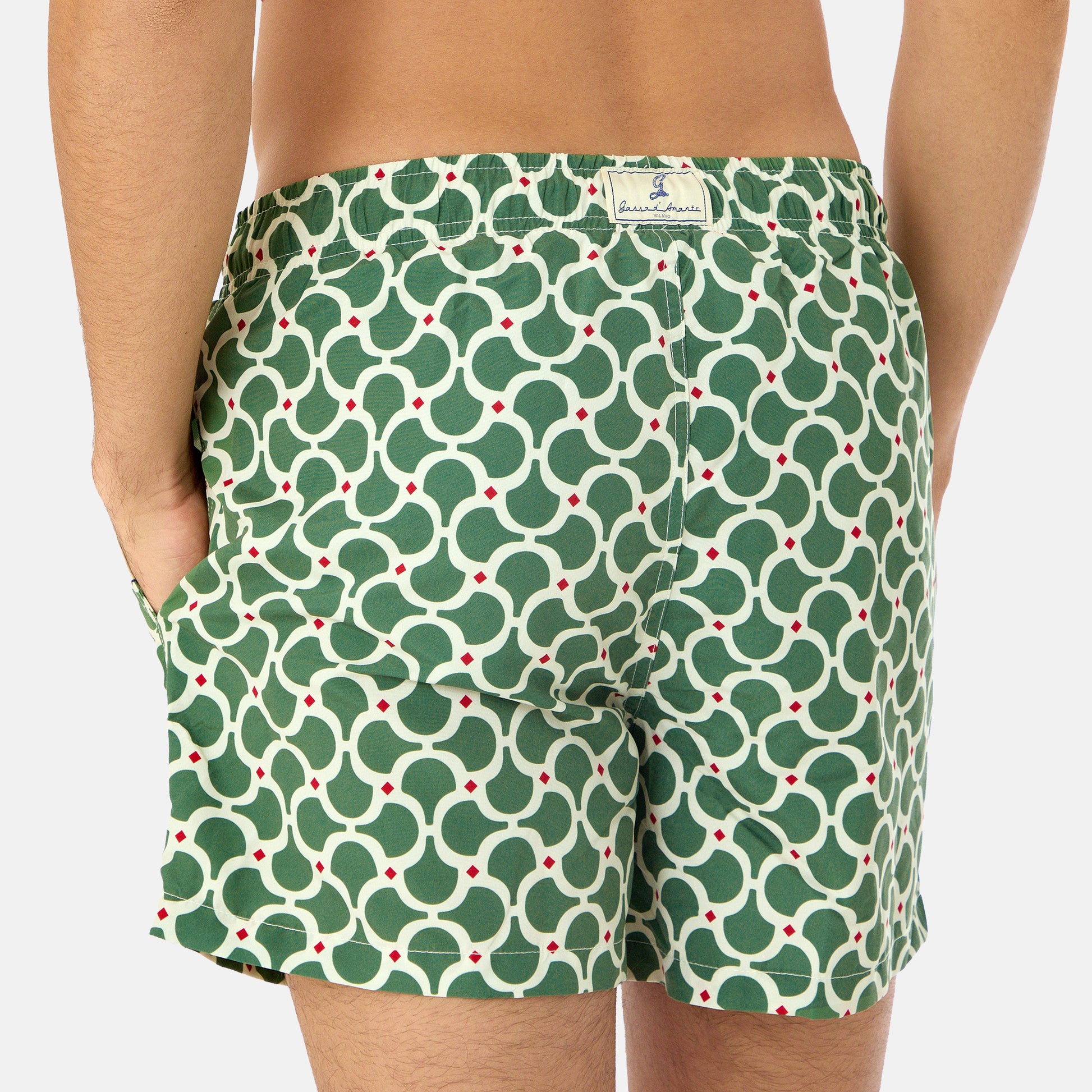 Costume da bagno sostenibile per uomo realizzato con tessuto 100% poliestere riciclato di alta qualità ottenuto da plastica recuperata dall’ambiente.
