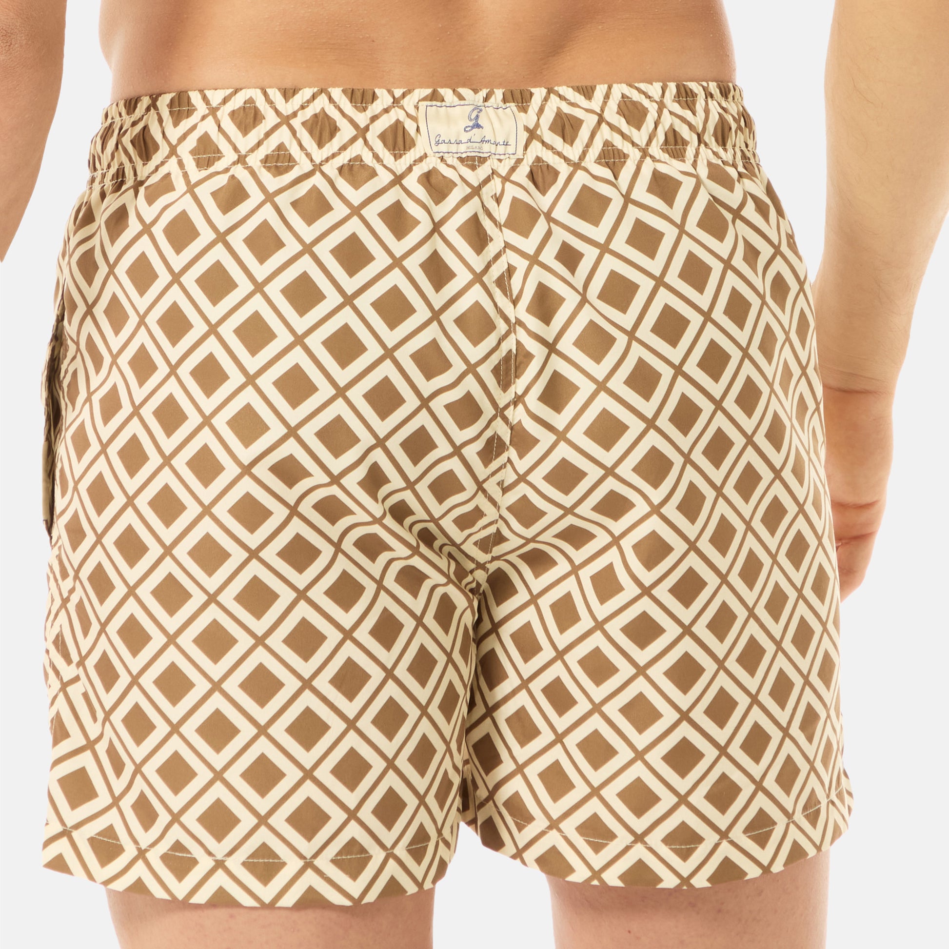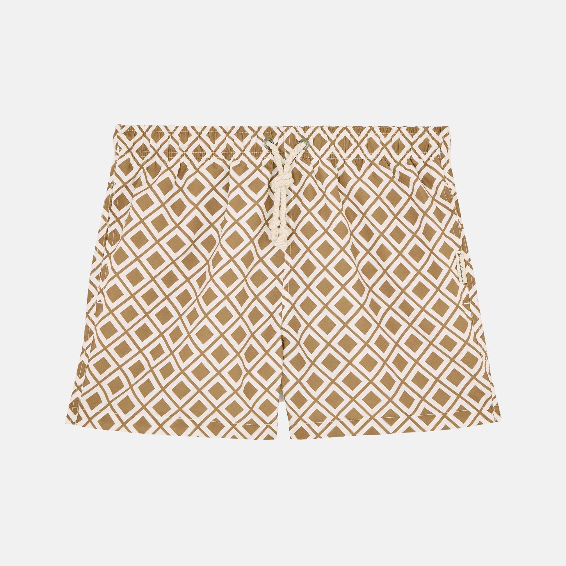 Totalmente cucito a mano, possiede una corda classica nautica in cotone, un’etichetta ricamata posta sul retro del costume e una doppia tasca laterale.