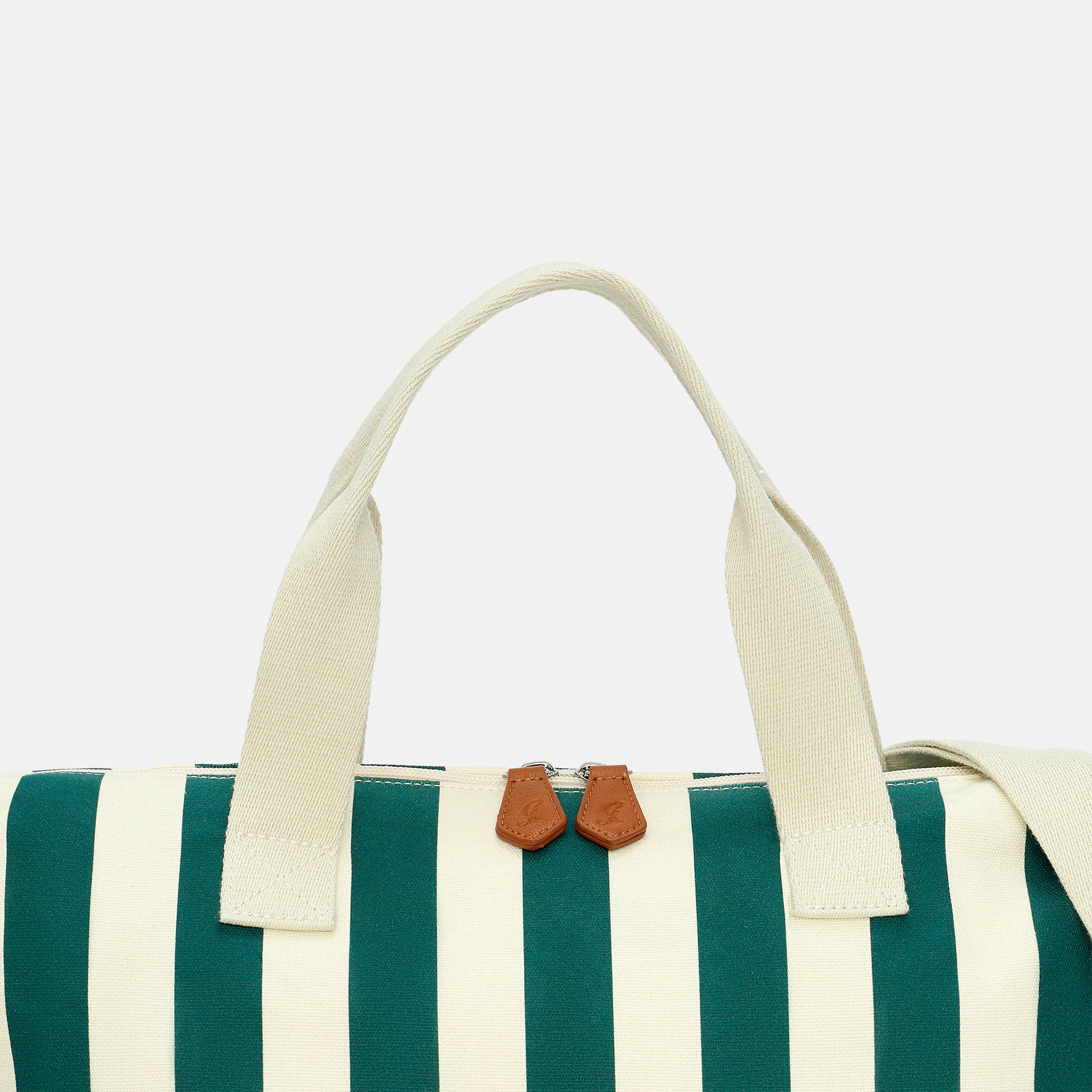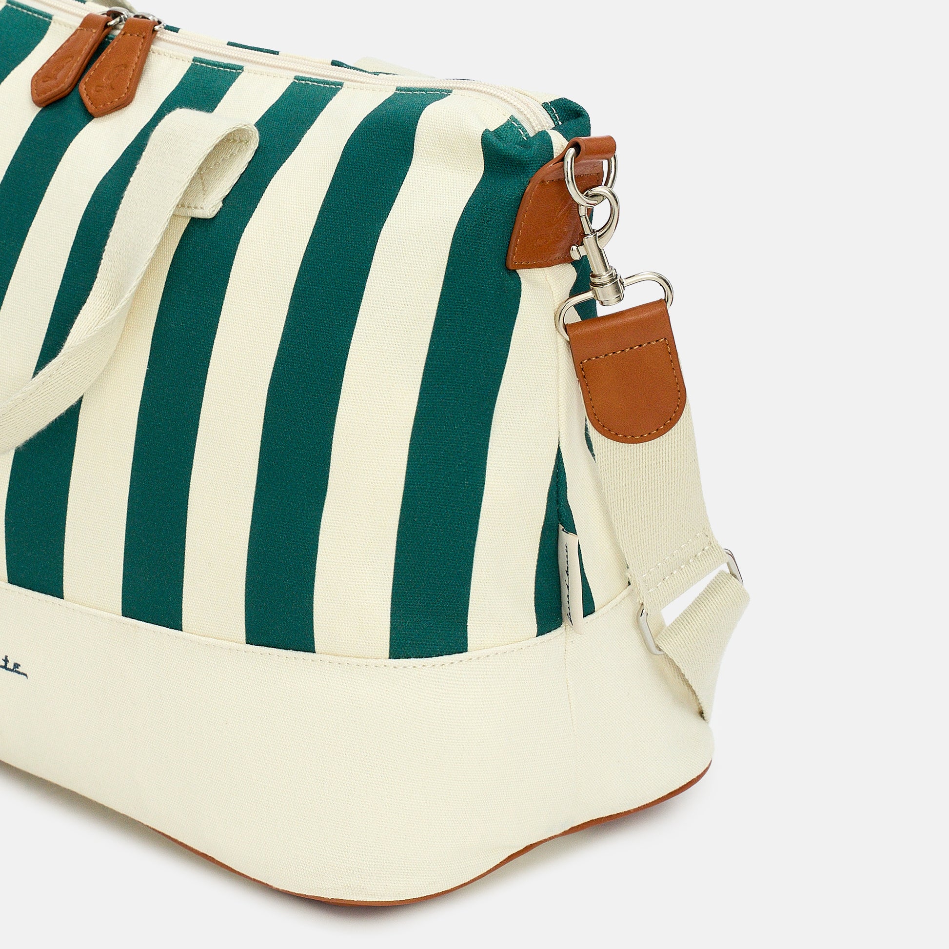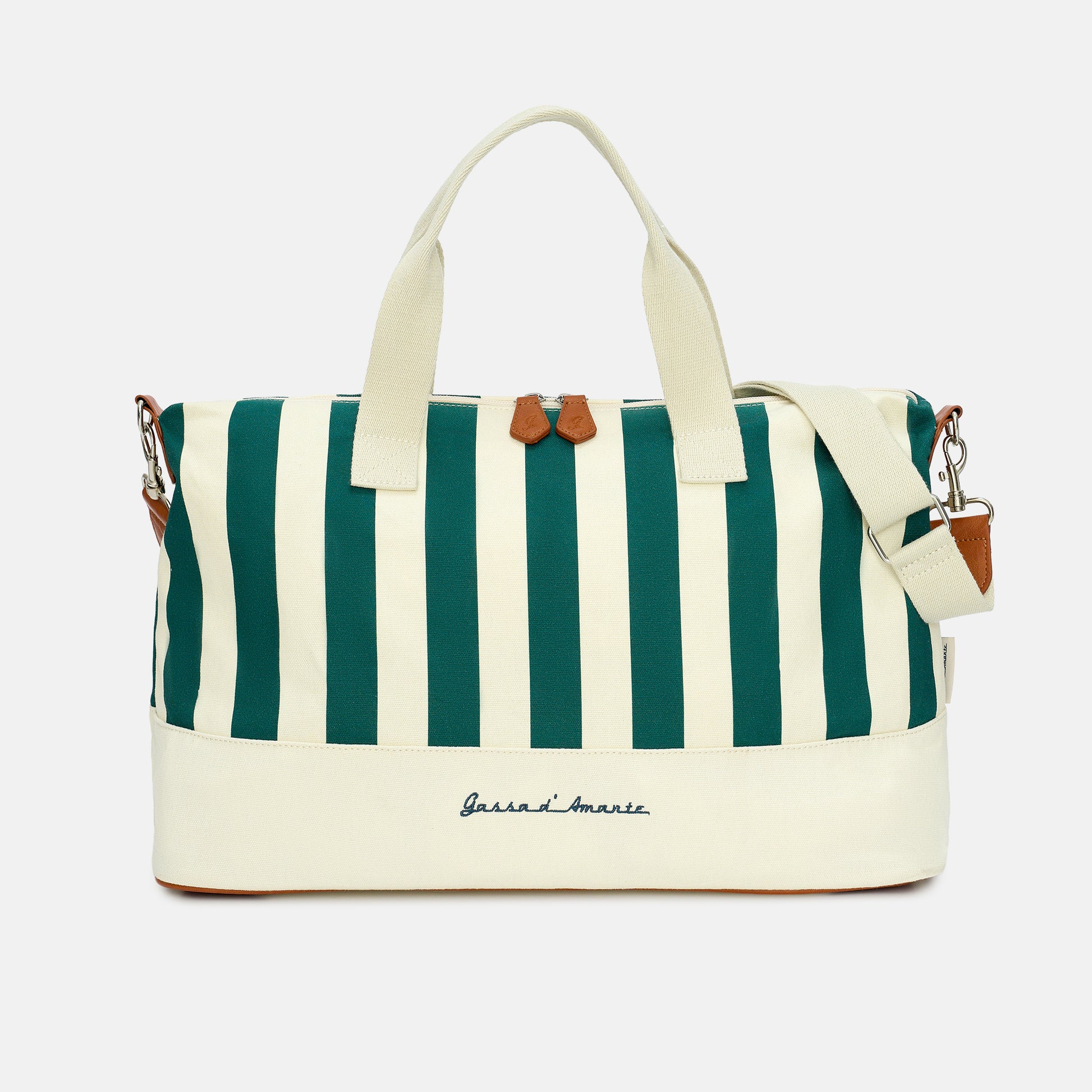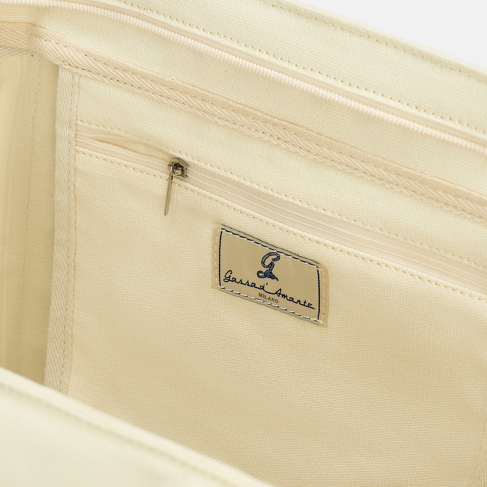 Totalmente cucita a mano, possiede due resistenti manici in cotone, una tasca interna con cerniera, una tracolla in cotone regolabile in lunghezza e una chiusura con cerniera zip e cursori personalizzati.
