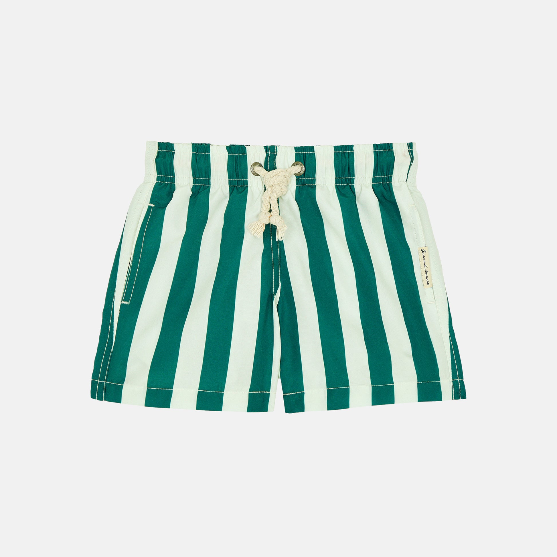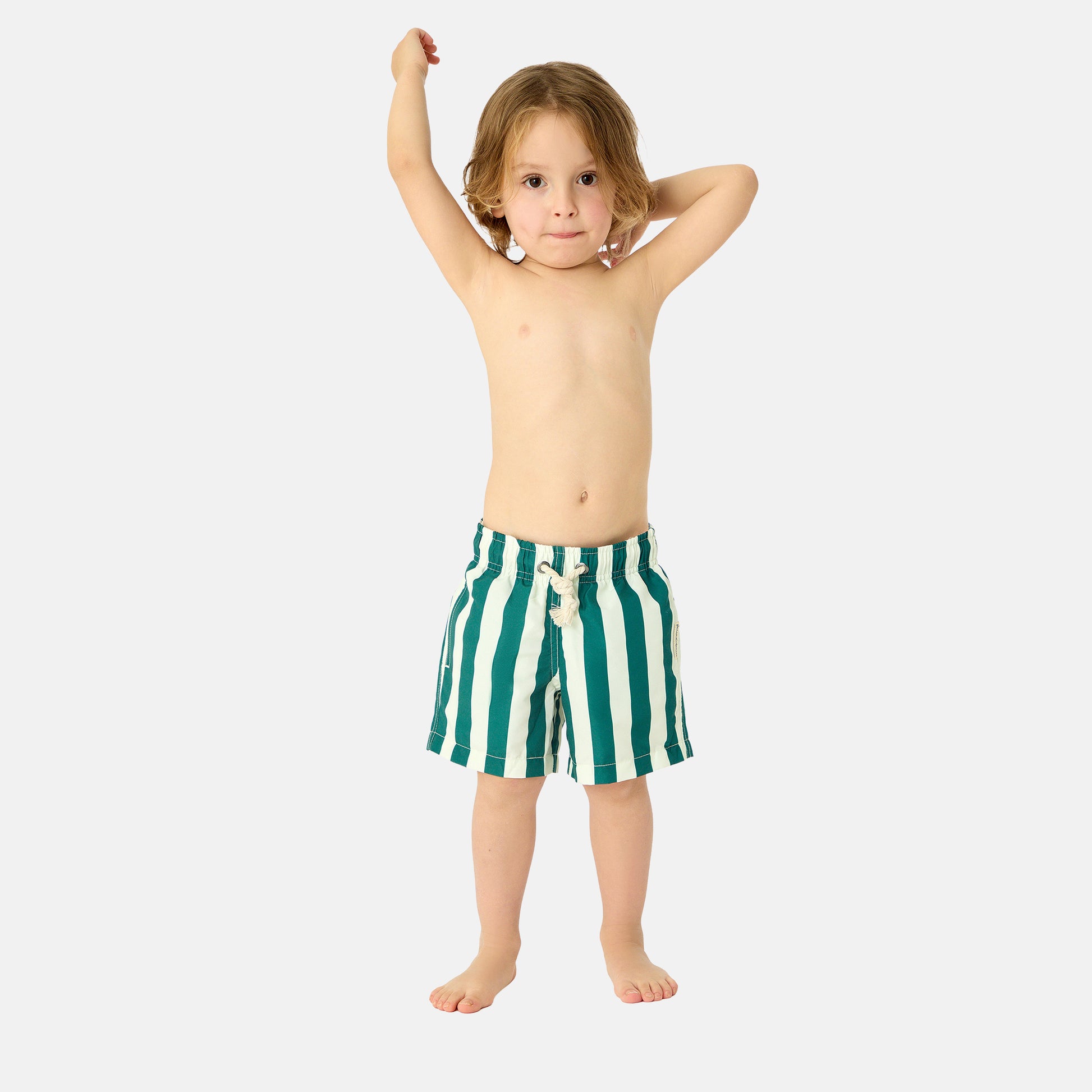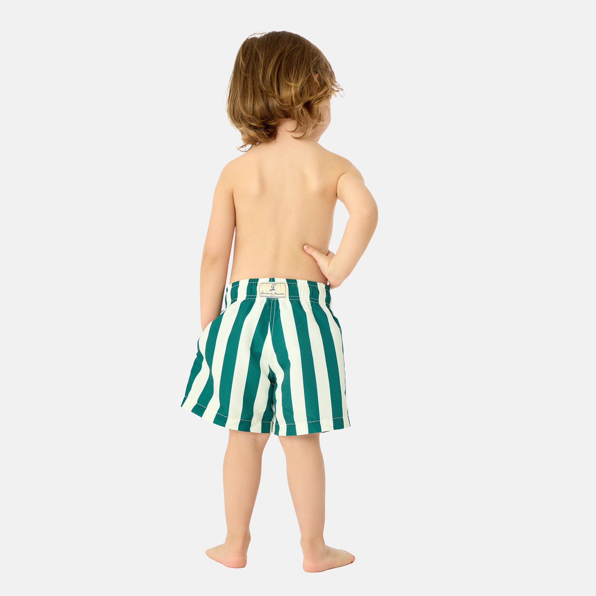 Costume da bagno sostenibile per bambino realizzato con tessuto 100% poliestere riciclato di alta qualità ottenuto da plastica recuperata dall’ambiente.